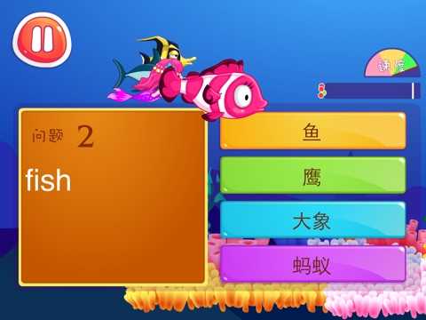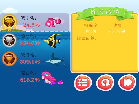 游戏以小鱼比赛的形式,让孩子进行答题练习,回答正确,小鱼就会往前游;每次玩一组测验,回答错误的答案将会被列出;完成比赛会获得名次,获得第一名才可以过关。答题过程中的准确率决定了获得星星的数量。