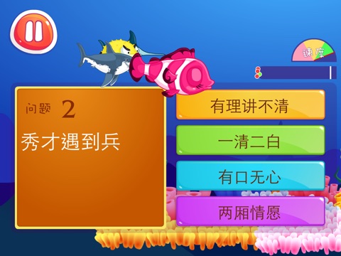 游戏以小鱼比赛的形式,让孩子进行答题练习,回答正确,小鱼就会往前游;每次玩一组测验,回答错误的答案将会被列出;完成比赛会获得名次,获得第一名才可以过关。答题过程中的准确率决定了获得星星的数量。