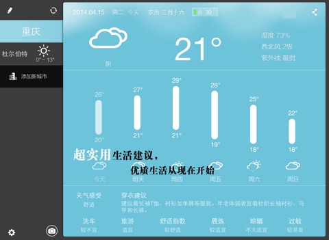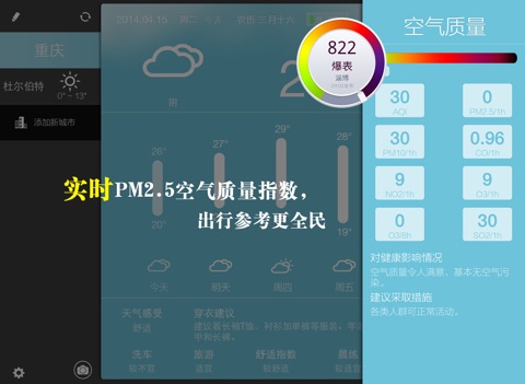 ③同时天气信息也很详尽, 支持PM2.5,湿度,紫外线,穿衣指数等。