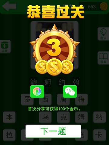 2、遇到不知道的,可以选择求救,可以把问题分享给微信好友与微信朋友圈中,不要忘了,金币可以用来提示与答案。