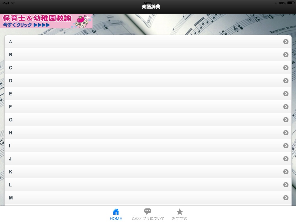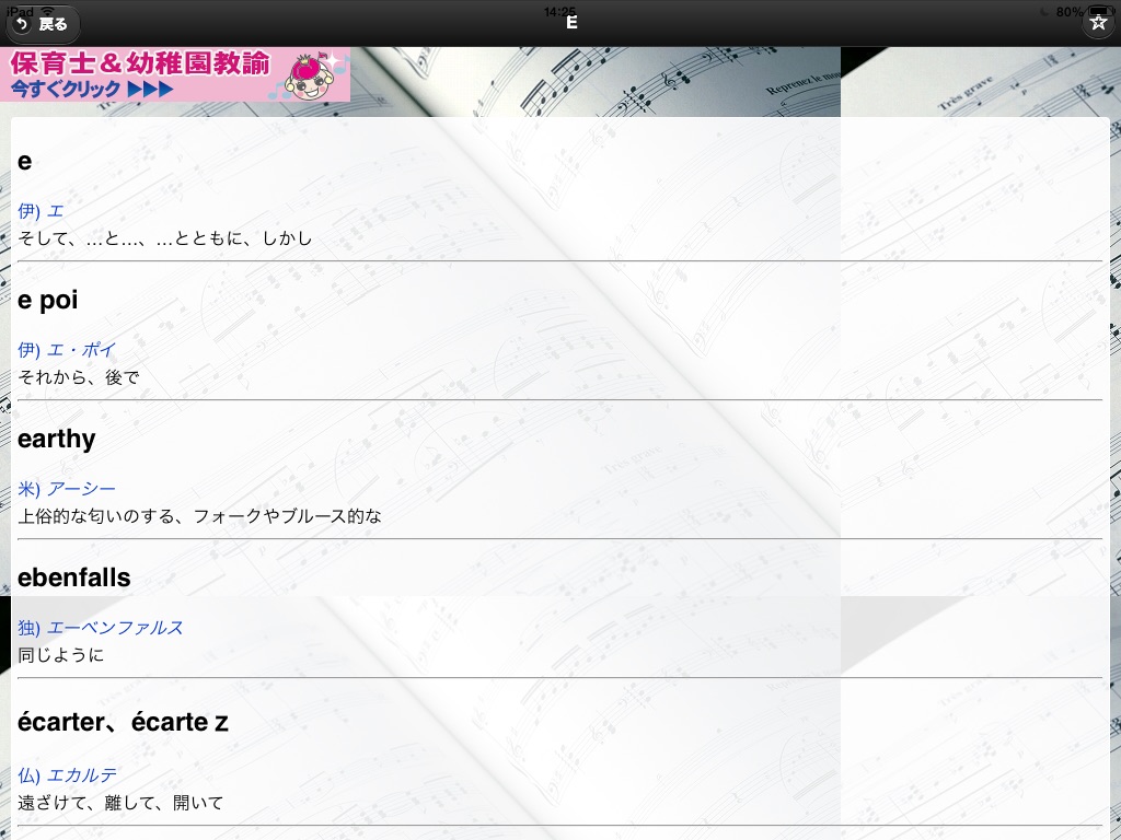 この楽語辞典は、音楽に使う楽語を調べたいときに使うアプリです。楽譜に書かれている音楽に使う言葉って、外国語が多くてよくわからない。読み方もわからないし、意味も分からない。そんな時に、このアプリを使えば、読み方も、使い方も、意味も探すことが可能です。初心者が使うものから、プロが使うものまでをまとめてみました。もっともっと音楽の世界が広がりますように!