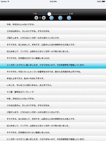 本应用分初级、中级、上级三大部分,共42课。采用由易到难,循序渐进的方式,在会话的基础上给以适当的语法说明。应用内容丰富、新颖。初级、中级的课后练习的目的在于通过模仿和反复练习,熟悉并掌握日本人的语言表达方式。