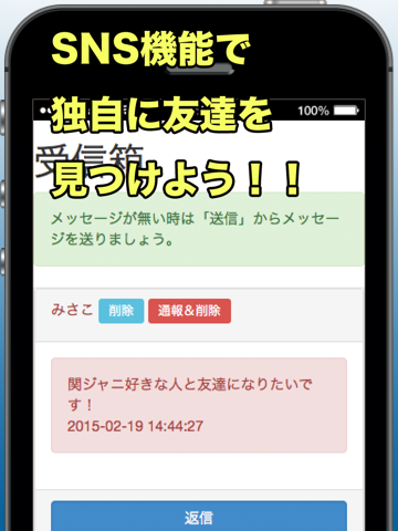 SNS機能は「通報&削除」機能があります。不快なメッセージがあった場合はこのボタンを押すことにより、不快なメッセージ削除した上で、送信したユーザーを遮断します。