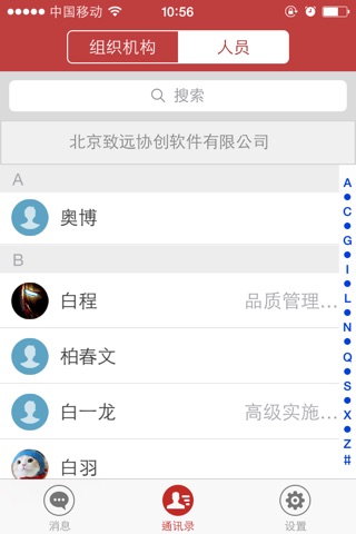 用户可以通过“致信”在iPhone上发起和回复工作微信、查看组织结构信息和同事通讯录信息,可以发送文字、表情、语音、图片、拍照、手机本地通讯录等。
