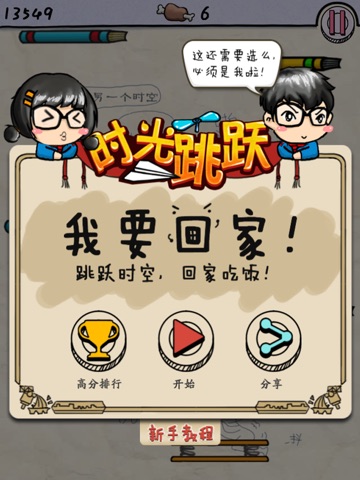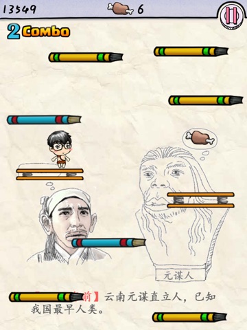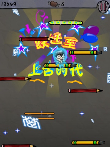 穿越失败了!回到了时空原点!!要想回到现在,必须努力往上跳!!每跳一层就相当于在历史上前进了一段时间!!!在跳跃的过程中可以看到各个时期的名人典故和大事件壁画!!!跳过他们,跨跃时代,就可以变身!!!