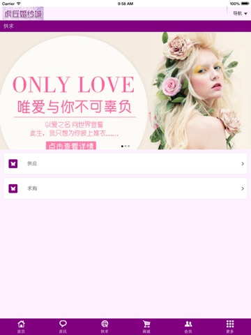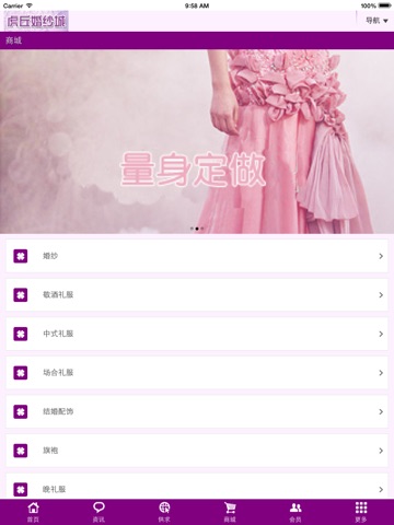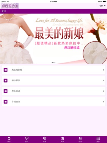 虎丘婚纱城APP手机客户端是针对婚纱各大中小型企业推出的全新营销平台, 在虎丘婚纱城APP手机客户端中有大量的婚纱行业群体企业,更有庞大的客户使 用群体,这一方便、快捷、新兴的移动 平台具备产品、供求、企业商家、地图 导航等强大功能,使得虎丘婚纱城APP手机 客户端很快成为婚纱行业中最热门的营 销渠道和平台!虎丘婚纱城APP手机 客户端现在诚招各大中小企业入驻!