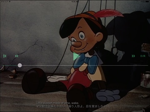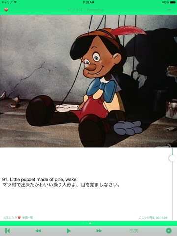 ディズニーの名作映画「ピノキオ」を観ながら、名シーン、名台詞とともに、記憶に残る英語を楽しく学習することができます。