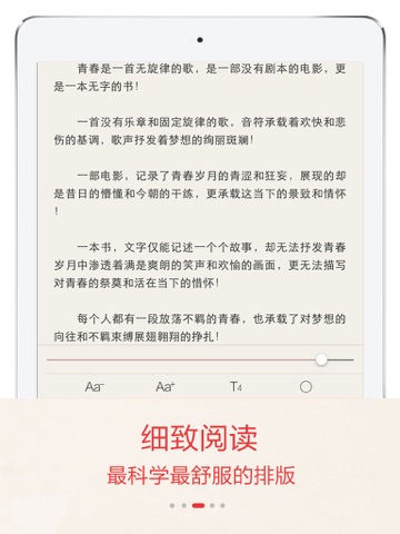 3.阅读界面友好,四种背景颜色、字体选择,记忆阅读,智能推荐,左右滑动翻页,封面精美。