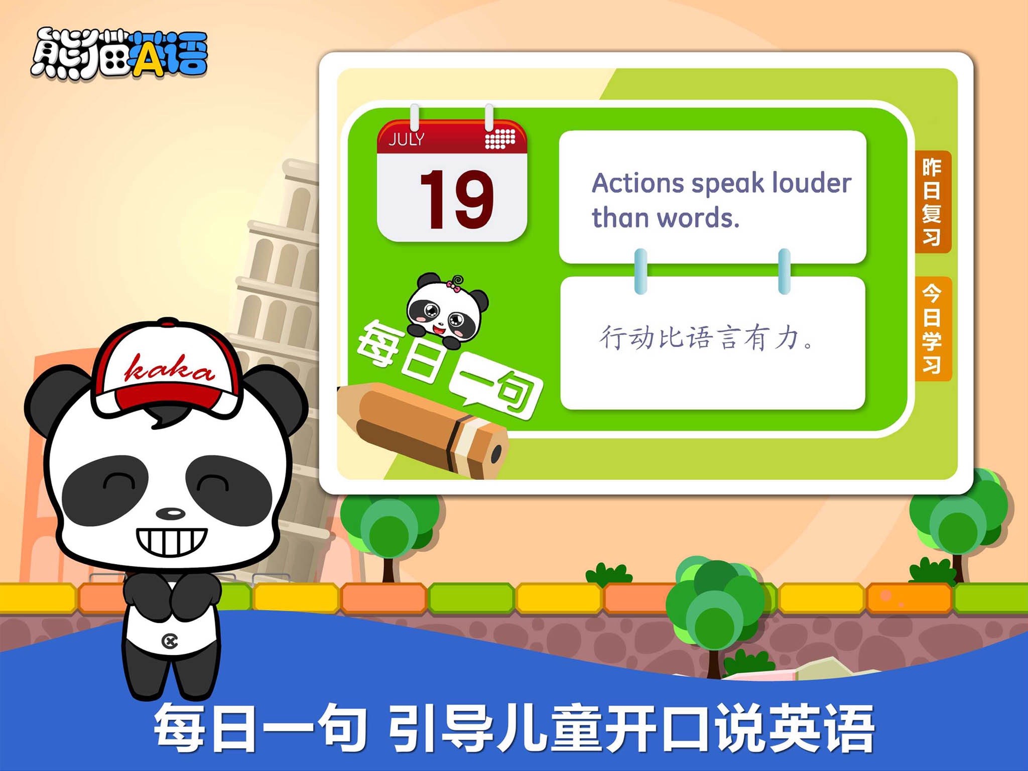 每日一句:经典短句,引导孩子开口说英语。通过每天学习一句的方式,让孩子了解掌握英语中的一些特定语法、句式,提高孩子的英语表达能力。