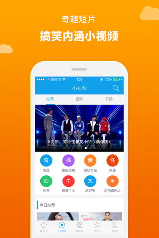同步聚合更新来自优酷、土豆、秒拍、爱奇艺、美拍、PPTV、乐视、风行、M1905电影网、CNTV、腾讯视频、搜狐视频、央视影音、PPS、芒果TV、迅雷看看等众多高清视频网站的搞笑、微电影、小视频、短片、娱乐、脱口秀、综艺、新闻资讯等影视资源,打造极致的观看体验!