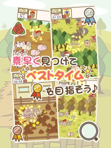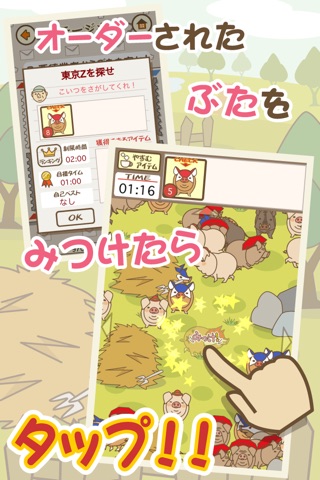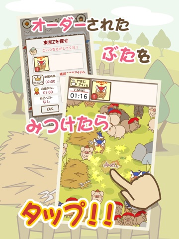スワイプでぶたをさがして、ぶたをみつけたらタップ!