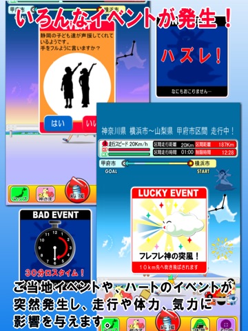 ・ランナーとの「会話」で出てくる各都道府県のご当地ネタやクイズ、また、突然発生する「ご当地イベント」がランナーの体力や気力に影響を与えることがあります。