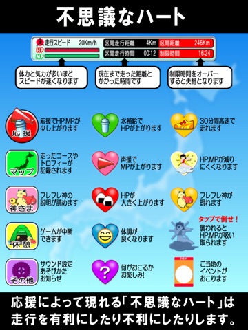 遊びかたはカンタン! スマホの中でリアルタイムで走り続けるランナーを応援でサポートしながら各コースを制限時間内にゴールさせ、そして日本縦断走破を達成させる放置系ゲームです。
