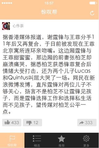 最具原创精神的娱乐八卦社区,人民群众智慧原创,其中网友活跃,写手众多,爆料层出不穷,让你惊叹不已。