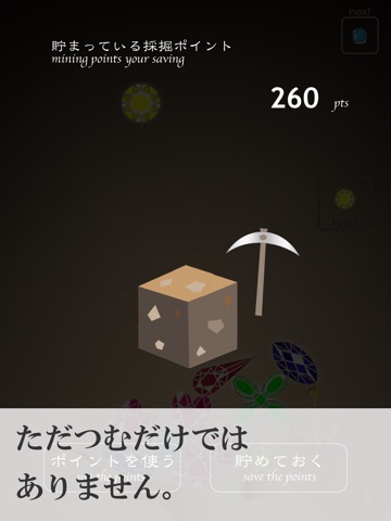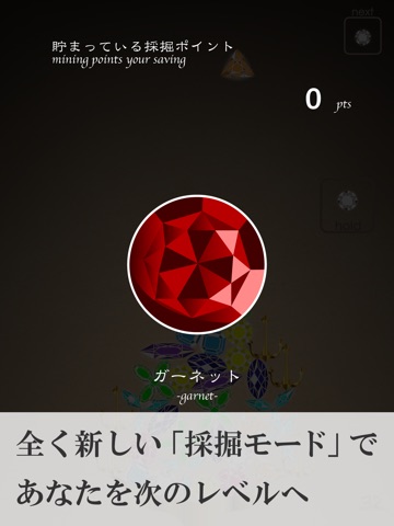 ゲーム終了時の「採掘モード」では、今までに貯めた「採掘ポイント」を使って宝石を発掘することができます。採掘される宝石の中には、プレー中に出現する「ゴールドアンカー」の出現率を上げるものがあります。ゴールドアンカーは他の宝石と違い、安定感があるので高く積み上げるカギとなります。