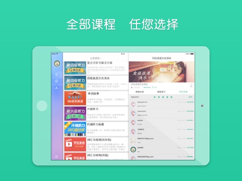 目前上线的课程有:英语四六级听力、阅读、写作、翻译,新概念英语,VOA英语 及走遍美国课程,TOEFL及IELTS课程,日语N1、N2、N3课程,考研英语课程以及学 位英语课程等数十堂课程。来自新东方、北京开放大学、北京外国语大学等一线教 师团队,独家权威讲解。