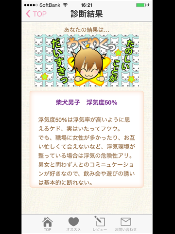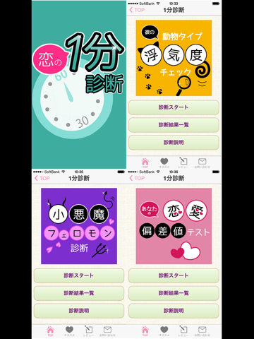 このアプリは、彼の浮気度を動物タイプでわかりやすく分けた「浮気度チェック」、あなたの恋のフェロモン放出度をチェックする「小悪魔フェロモン」、ズバリあなたの恋愛力をチェックする「恋愛偏差値テスト」と、3つの診断アプリをパッケージしました!しかも、それぞれ1分程度で結果がわかるので、デートの前や休憩時間などちょっとした合間でチェックができます!しかも無料!