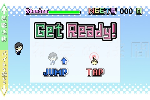 画面をタップするとニートが上に飛び上がります。落ちないように、一定の間隔でタップし続けて下さい。
