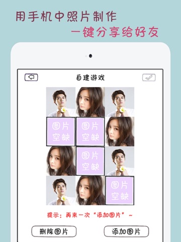 √操作简单:只需拍照或选择图片,就能用家人朋友或是偶像的图片生成个性化的连连看游戏。
