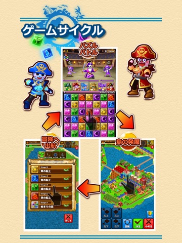 いろんな島に冒険へ行き、さまざまな敵の海賊とパズルバトルが発生します。