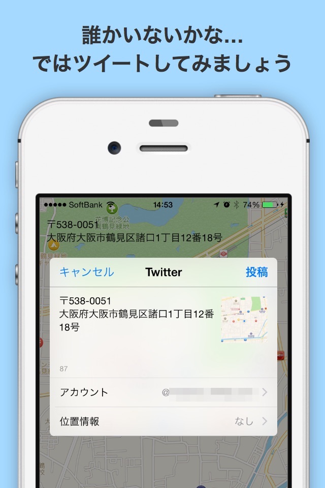 現在地をワンタップで,簡単に所定の相手に知らせる,あるいはTwitterで拡散することが出来ます.