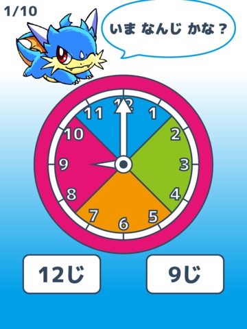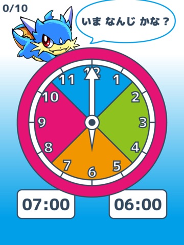 時計の読みを楽しく学べるアプリです。ひらがな・デジタル・時計合わせの3種類を時間と分を段階的にトレーニングできます。