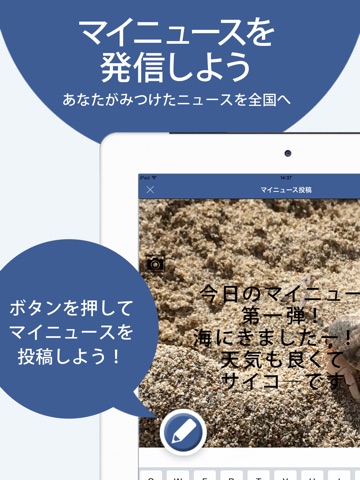 ニュース画面左下の鉛筆マークをタップすることで、その日あった出来事などをマイニュースとして投稿できます