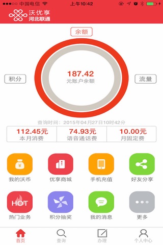 “河北联通沃优享”是河北联通为客户智能手机桌面上的服务空白开发的移动互联网服务应用,通过本客户端用户可以更简单快捷的查询自己的话费余额积分详情等信息,可以更方便的进行积分的兑换,随时随地查看用户所在地的优惠信息,并可以查看最新的合约机的优惠信息并进行预约!