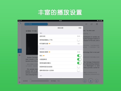 - 拥有每天更新的海量听力库,并独家提供智能语音高亮跟随功能
