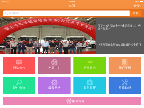 展示联合卡车各车型的用户手册及相关视频,满足车主使用;为车主提供用车养护、节油等信息;为车主提供故障救援服务;为用户提供联合卡车全国的服务、经销和配件网络查询;展示联合卡车最新资讯和动态;为服务站提供故障诊断信息查询及故障诊断支持。