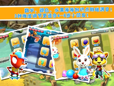 游戏中可以使用红袋鼠,火帽子,嘟嘟熊,叮当狗等多个儿童熟知的卡通角色,6种迷你小游戏从易到难,每个孩子都能轻松上手,并且能够有效提高他们对图形,数字,颜色的认知,锻炼反应和手眼协调能力。
