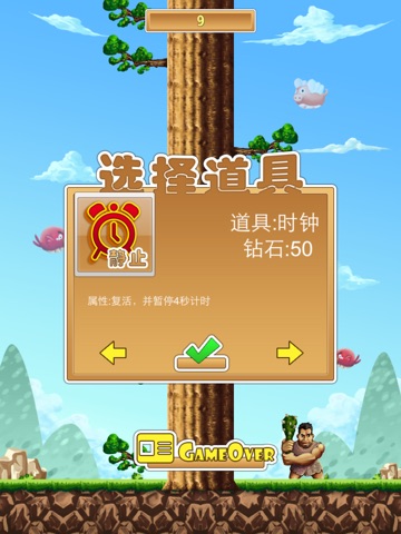 点击屏幕左右砍树,注意不要碰到树枝。争取让隐藏英雄激活技能,英雄挂彩之后可以选择使用道具继续游戏,所有道具包含一次生命。最多可以连续使用五次道具,选择自己擅长的道具努力争取最高分,看谁可以创造最高纪录。