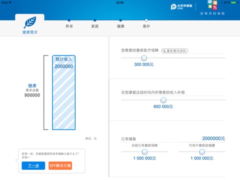 “幸福魔方APP”是一套专业的保险需求分析工具,它从教育金需求、养老金需求、家庭保障需求、意外保障需求四个维度,对“福宝宝(即少儿阶段)”、“福盈门(即起步阶段)”、“福满堂(即成家立业)”、“老来福(即接近退休)”四个不同人生阶段进行量化需求分析,并提供建议解决方案。