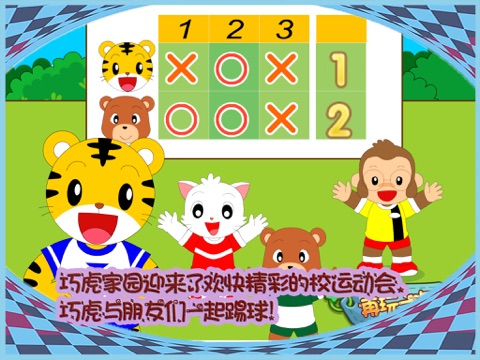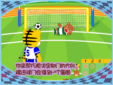 小朋友,你来帮巧虎决定射门的方向,踢进球门会得到一个圆圈,没有踢中会得到一个叉叉,完成三局后就可以分出输赢!