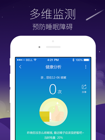 · 睡眠统计:分析您的睡觉状况,统计入睡时长、浅睡时长、深睡时长、觉醒次数以及打呼次数;