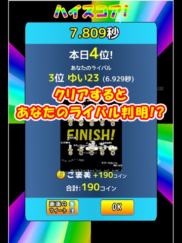 秒数が速いほど、コインが貯まるよ。