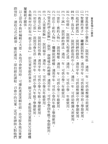 適用:國小六年級下學期。帶領兒童過健康的召會生活,建立屬靈的基本操練,過身體的生活,為主申言、傳福音。認識召會的歷史與主的恢復,豫備他們成為主合用的器皿。另有親子手冊二冊。