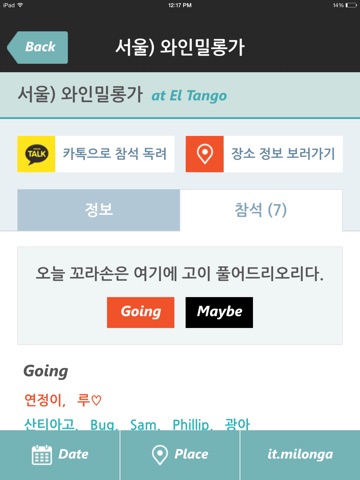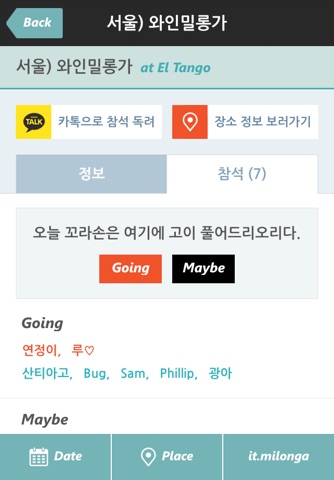 밀롱가를 즐기는 밀롱게로들을 위해서, 매일매일 서울의 밀롱가 정보를 한눈에 확인 할 수 있는 "잇.밀롱가"가 런칭되었습니다. 날짜 별 밀롱가 정보와 밀롱가가 열리는 장소의 정보도 함께 확인 할 수 있습니다. 앞으로, 순차적으로 전국, 아시아, 세계의 밀롱가 정보를 볼 수 있도록 업데이트 할 예정입니다.