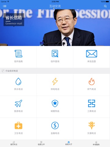 政民信件互动及服务查询。包括:省长信箱、部门信箱、在线办事服务等