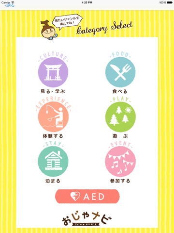 「観光ナビ」アプリを起動して、見たいジャンルを選択すると、関連したお店や施設の情報がご覧になれます。さらに気になった場所はルート案内で場所を確認できます。