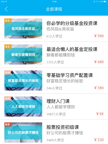 担心课程太难学不会?不用担心,股票课程由浅入深:入门课,初级课进阶课。如果不想在股市搏杀还能选择基金定投课。如果十分害怕亏损,还有绝不会亏钱的7种武器帮你避开风险赚取收益。