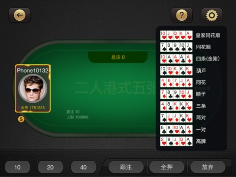 港式五张,是扑克游戏的一种。以五张牌的排列组合、点数和花色大小决定胜负。游戏开始时,每名玩家会获发一张底牌,此牌为暗牌;当派发第二张牌后,便由牌面大者决定下注额,其他人有权选择“跟注”、“加注”或“放弃”。当五张牌派发完毕后,各玩家翻开所有底牌来比较,在全世界纸牌游戏地位非常高,深受人们的喜爱。