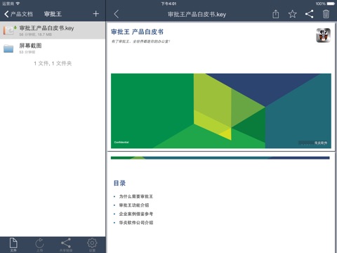 华炎企业网盘支持Web端、PC端、以及移动端(iPhone、iPad)多平台数据同步,实现数据无缝对接,随时随地访问云端文件,轻松实现移动办公。