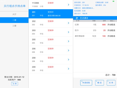 天行点单是专门针对KTV经营场所设计的智能移动点单客户端软件,场所工作人员通过IPAD即可便捷实现开台申请、结账申请、点单、赠送、查单等功能。