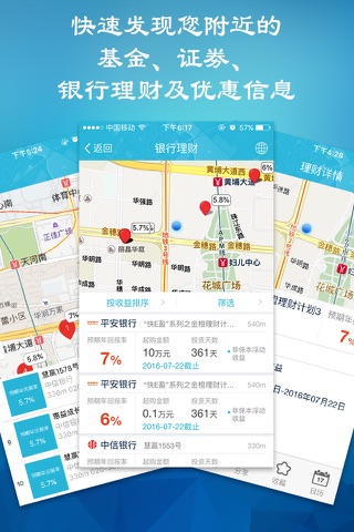 1.实时提示您位置附近的高回报理财产品、分期购物产品、信用卡优惠、团购、商家促销活动。覆盖58个主要城市,1200家金融机构的金融产品。超方便!