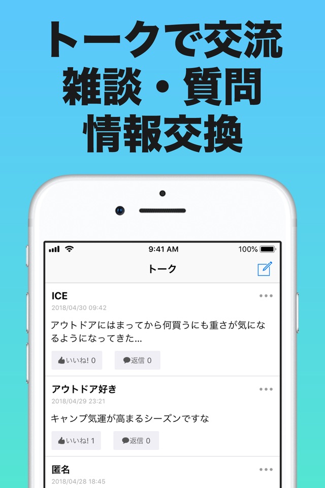 ・トーク機能ではアウトドアに関する情報交換や雑談ができます。