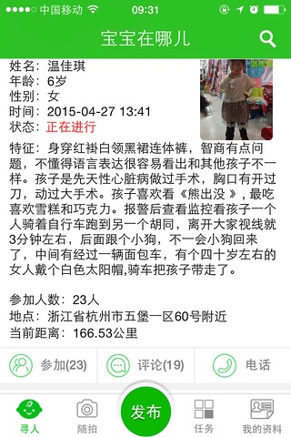 消息:发布消息时及时通知附件的用户一起帮助寻找丢失的孩子。