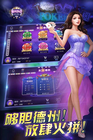 指掌火拼德州,All-in一触即发!PK对手?精英荟萃!活动比赛?如临赌城!任务成就?步步惊心!表情道具?想甩就甩!