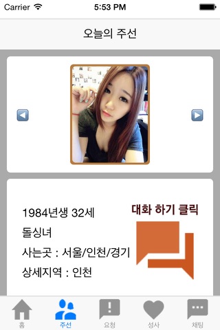 3단계. 주선된 이성 프로필을 꼼꼼히 보고 맘에 들면 대화신청 버튼을 터치합니다.