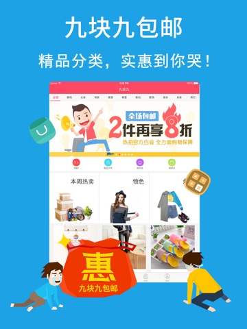 2.每天千余款9.9元包邮商品推荐,数码、男装、女装、家居、母婴、鞋包、配饰、美妆、美食、娱乐、电影,藏不住的诱惑就在九块九包邮!
